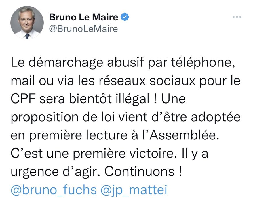 C'est le 7 octobre, alors qu'un député cite Maeva Ghennam à l'Assemblée Nationale en évoquant les arnaques au CPF (on croit rêver !), que Bruno Lemaire se gargarisa sur Twitter ..."Le démarchage abusif par téléphone, mail ou via les réseaux sociaux en lien avec le CPF sera bientôt illégal".